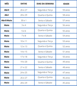 A vacinação, de forma unificada, irá começar no dia 26 de abril nos quatro municípios citados na matéria. Confira o calendário de imunização para os grupos prioritários: