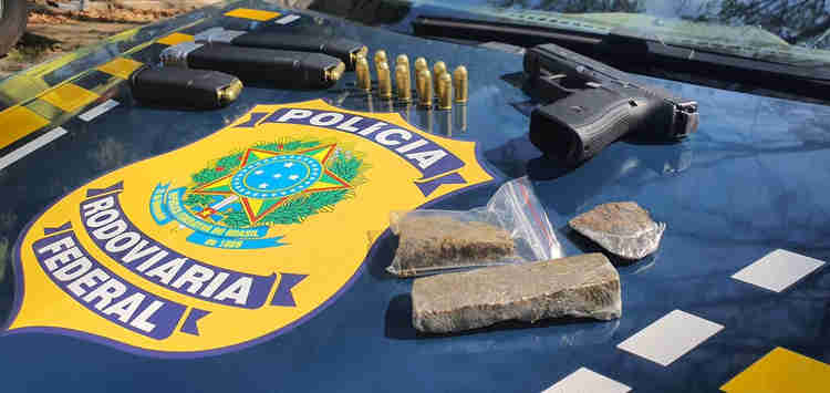 Ainda foram localizados uma pistola Glock, calibre 45, com kit rajada, três carregadores, sendo dois alongados, 62 munições e aproximadamente 50 gramas de maconha.
